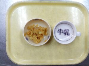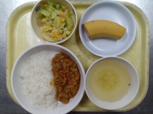 2026年01月21日☆昼食・おやつ☆ 昼食 ・ドライカレー ・キャベツとハムのフレンチサラダ ・コンソメスープ(だいこん・じゃがいも) ・バナナ おやつ ・牛乳 ・さつまいもきなこシュガー 2026年01月21日14時46分