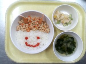 2026年02月03日☆昼食・おやつ☆ 昼食 ・おにさんライス ・和風ポテトサラダ(ツナ・コーン) ・みそ汁(ほうれん草・れんこん) おやつ ・牛乳 ・バナナパウンドケーキ 2026年02月03日14時27分