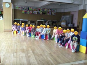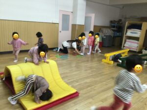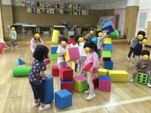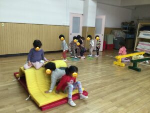 2026年04月21日うさぎ組 ホールで遊びました 2階のホールに行ってアスレチックごっこをしました。平均台を渡り、輪っかを歩いてマットの山を越え、ポールをジャンプしました。 大型ブロックで遊びました。 2026年04月21日13時48分