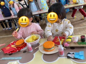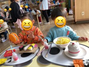 2026年01月20日レストランごっこに招待してもらいました🐼 今日はレストランごっこに招待してもらったので、行ってきました🌟 自分達でお金を持って食券を買いに行きます🛍 席に案内してもらい、待っているとご飯が届きました😆 お箸も使えちゃいますよ〜🥢 この後は本物のジュースとお菓子を食べることが出来て嬉しそうな、ひよこ組さんでした♪ 2026年01月20日14時54分